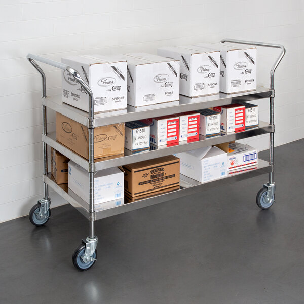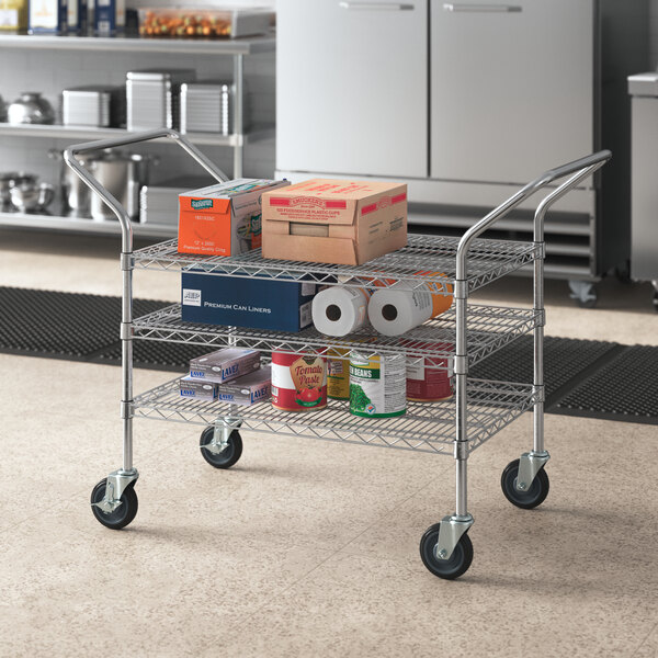24" x 41 3/4" Three Shelf Chrome Utility Cart with U-Shaped Handle and W...