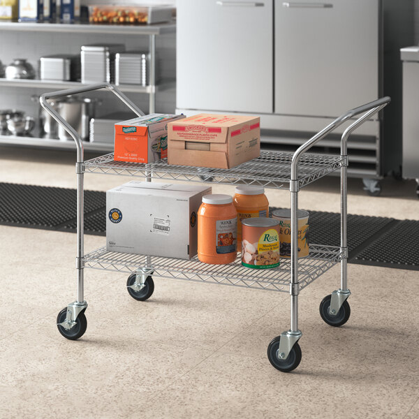 18" x 29 3/4" Two Shelf Chrome Utility Cart with U-Shaped Handle and Woo...