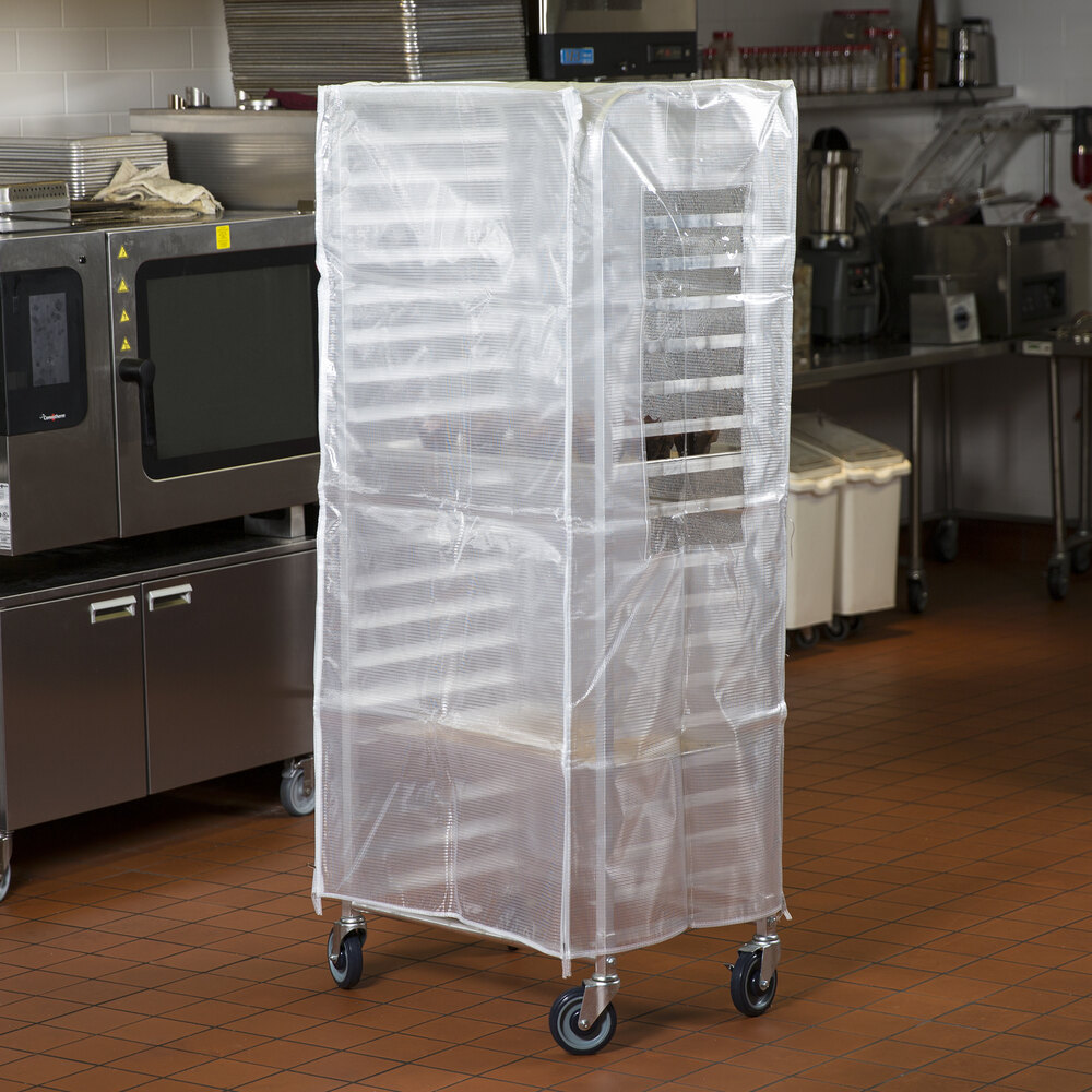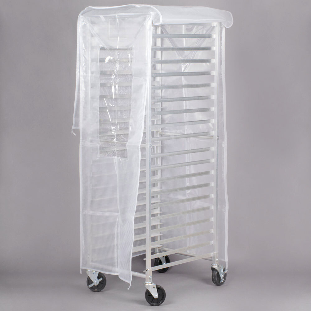 This convenient 20 mil translucent plastic bun rack cover is perfect for keeping baked goods fresh, providing peace of mind in knowing that your food items are always protected from harmful germs or other debris. Sized to fit many popular full height pan racks, it's easy to slip on and off and wipe down to keep clean. Plus, once you're finished, it folds neatly for space-saving storage.