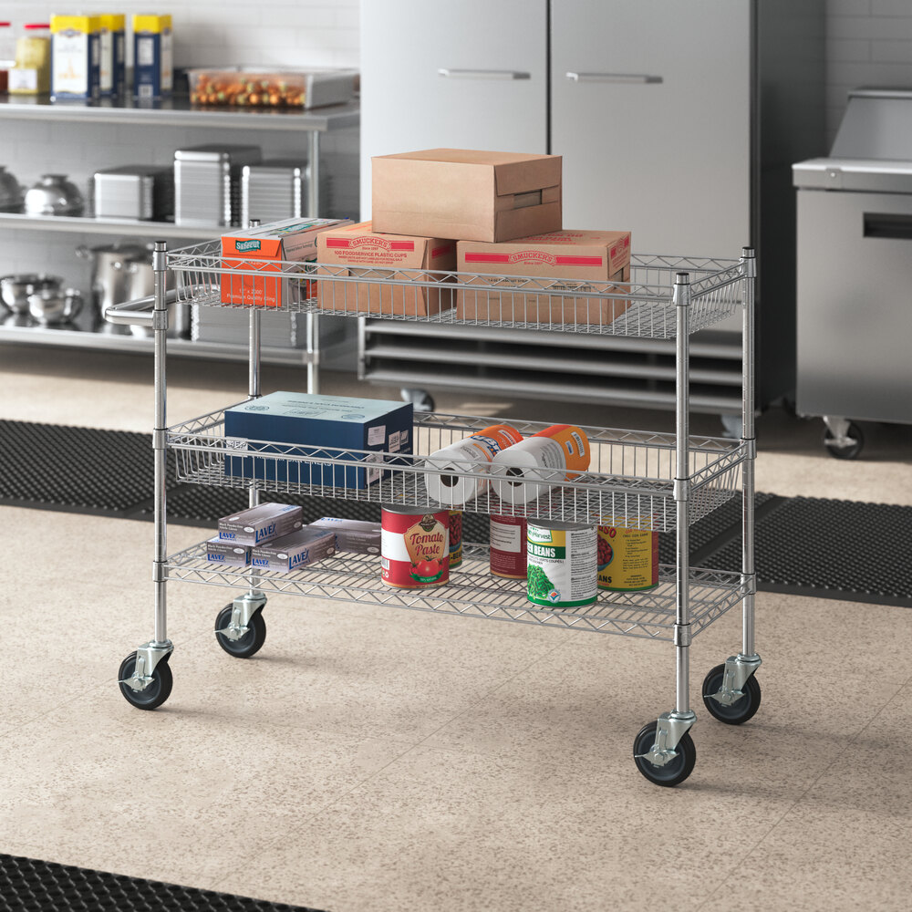 An excellent addition to your office, warehouse, retail facility, or food service establishment, this cart provides the strength that you need in your commercial location. With this utility cart, you can easily move large products around your establishment. This product features two basket shelves with a weight capacity of 600 lb. per shelf, making it perfect for maneuvering heavier supplies. Crafted from durable chrome materials, this item is sure to stand up to long-term use in your commercial environment.