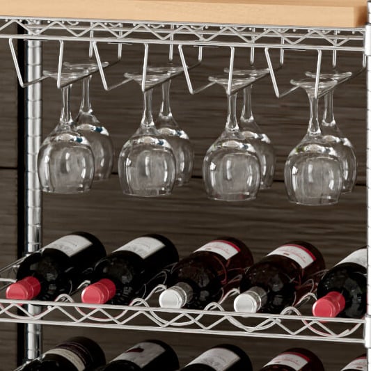 In addition to displaying your wine bottles, this shelving unit can conveniently hold your stemmed glassware with the (4) 14" stemware holders. Each chrome stemware holder attaches to the underside of your wire shelves to securely hold wine glasses, saving you valuable storage space and time! Glasses slide easily in and out of the stem holder's opening slot for quick access. This holder conveniently hangs glasses upside down to prevent dust, germs, or debris from falling into the bowls of your glasses.