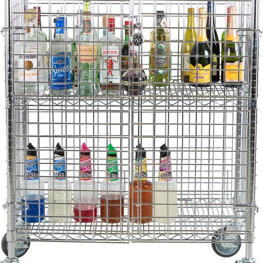 A Regency mobile chrome wire security cage kit transports easily and protects its contents from damage or theft. Because this unit also has multiple shelves, it will optimize storage space in your wine cellar, liquor closet, or back-of-house area. Additionally, its chrome construction is very durable and works well in both dry or room temperature environments. Finally, the open wire design minimizes dust accumulation, is easy to clean, and provides maximum visibility of the cart's contents.