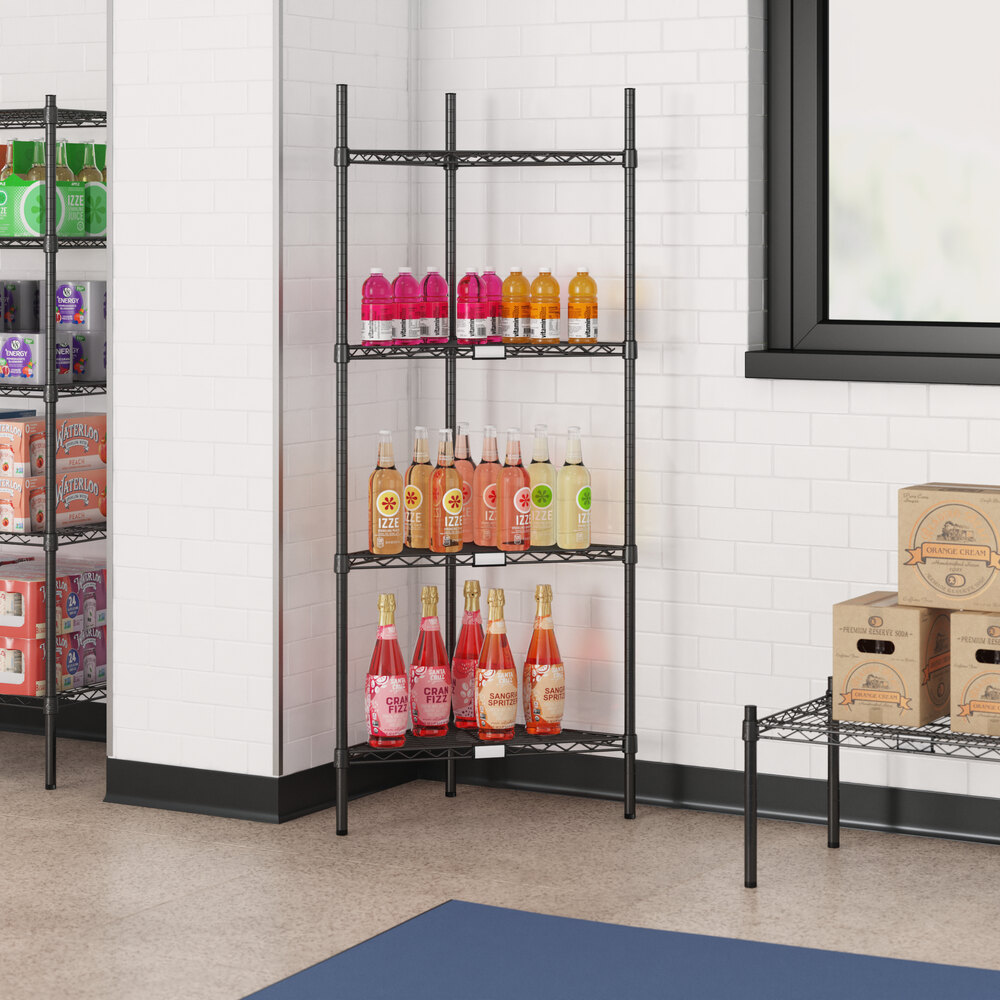 Regency's black shelf kit with 64" posts will save space and organize storage areas in your restaurant, hotel, bar, or warehouse. Its durable chrome construction can stand up to heavy loads, and the epoxy coating allows you to use this kit in back-of-house dry storage areas. This attractive shelving unit also works well in front-of-house merchandising and display spaces in your boutique or market.