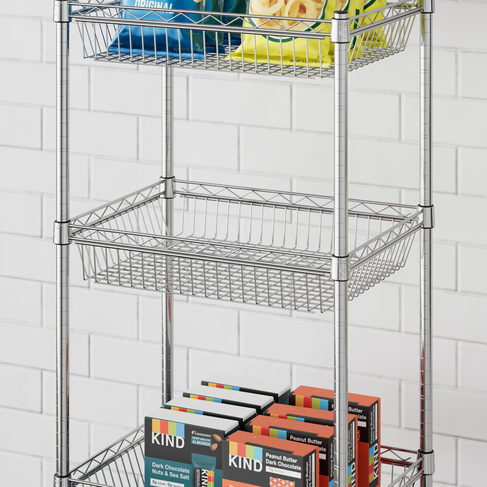 This Regency 18" wide chrome shelf basket is perfect for use in your restaurant, warehouse, or grocery store! Designed to fit onto your shelving unit in place of a traditional flat shelf, this shelf basket provides easy access to your items while keeping them securely in place. Plus, this shelf comes with four pairs of split sleeves that are used to attach the basket to its compatible posts and accessories for an easy setup.