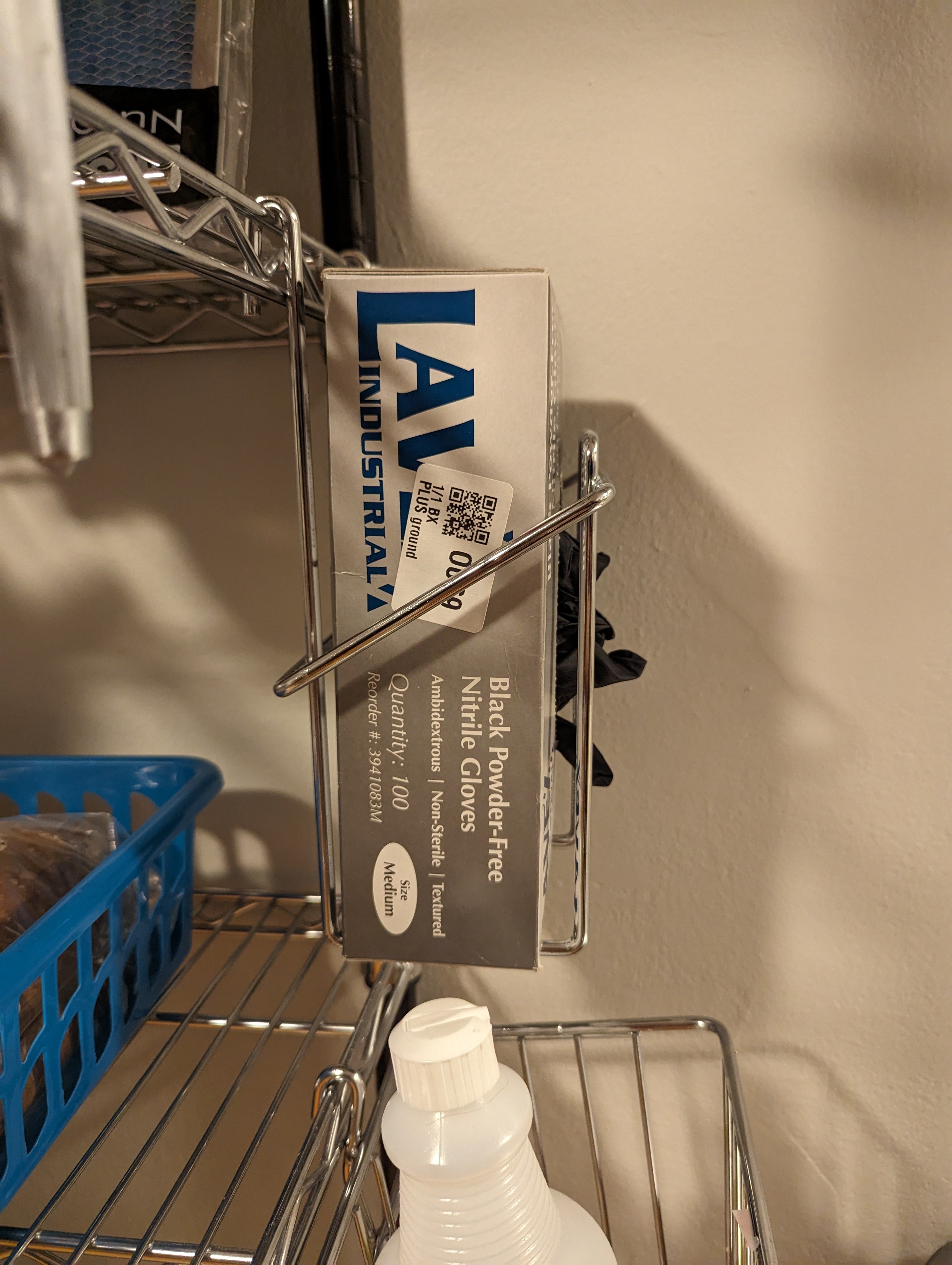 This glove box holder is very useful because it makes it easy to have your gloves located near your workstation. I find myself using gloves more often now that they're within reach. Easy clip-on mounting to wire racks.