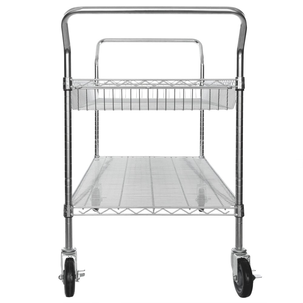 An excellent addition to your office, warehouse, retail facility, or food service establishment, this cart provides the strength that you need in your commercial location. With this utility cart, you can easily move large products around your establishment. This product features one flat shelf and one basket shelf with a weight capacity of 600 lb. per shelf, making it perfect for maneuvering heavier supplies. Crafted from durable chrome materials, this item is sure to stand up to long-term use in your commercial environment.