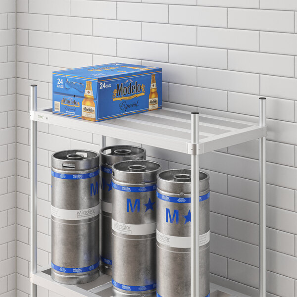 Designed for use with Regency keg racks, this shelf is a perfect replacement for the top shelf on a Regency aluminum keg rack (sold separately), making for convenient adjustment that ensures this unit serves your needs at all times. It is also easy to assemble, so you can get it from the box to the storage room quickly.