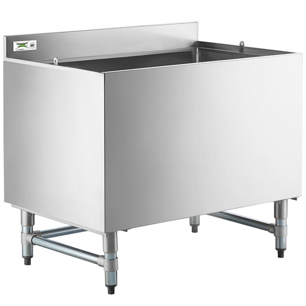 Designed for exceptional durability and long-lasting use at your restaurant or bar, this beer box also has a 3" backsplash to protect the wall and help maintain a sleek, professional appearance. This unit features a mostly stainless steel construction, including an 18 gauge, type 304 stainless steel bowl, top, bottom, backsplash, and apron. It has a 16 gauge type 304 stainless steel perforated false bottom, galvanized steel legs and sockets with U-shape leg bracing, and plastic bullet feet.