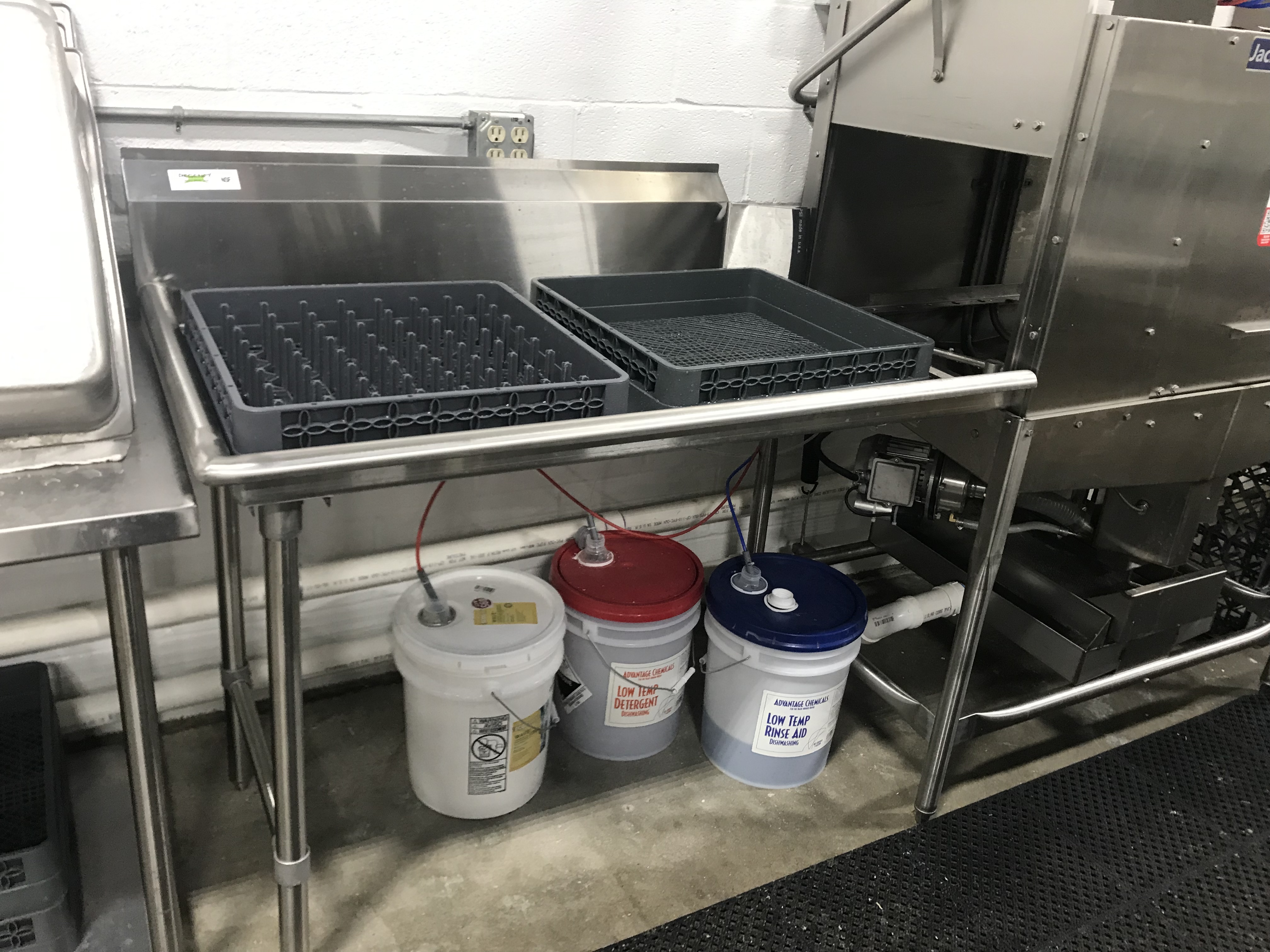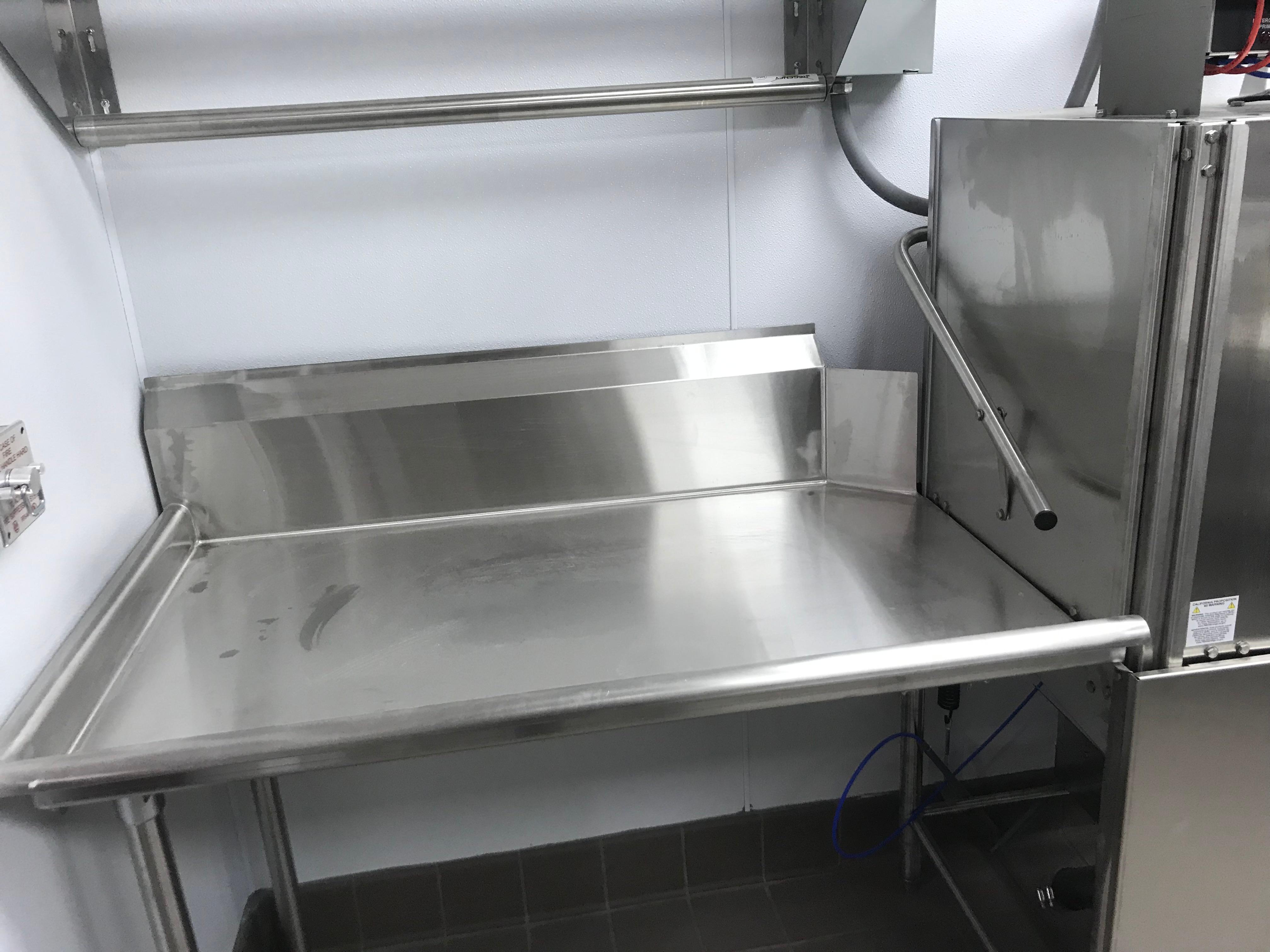 Perfect table for the dish machine. it has extenders in the 2 legs so you can balance it on super uneven floors. It sits nicely on the machine and it does not seem to be leaking at all. we like it