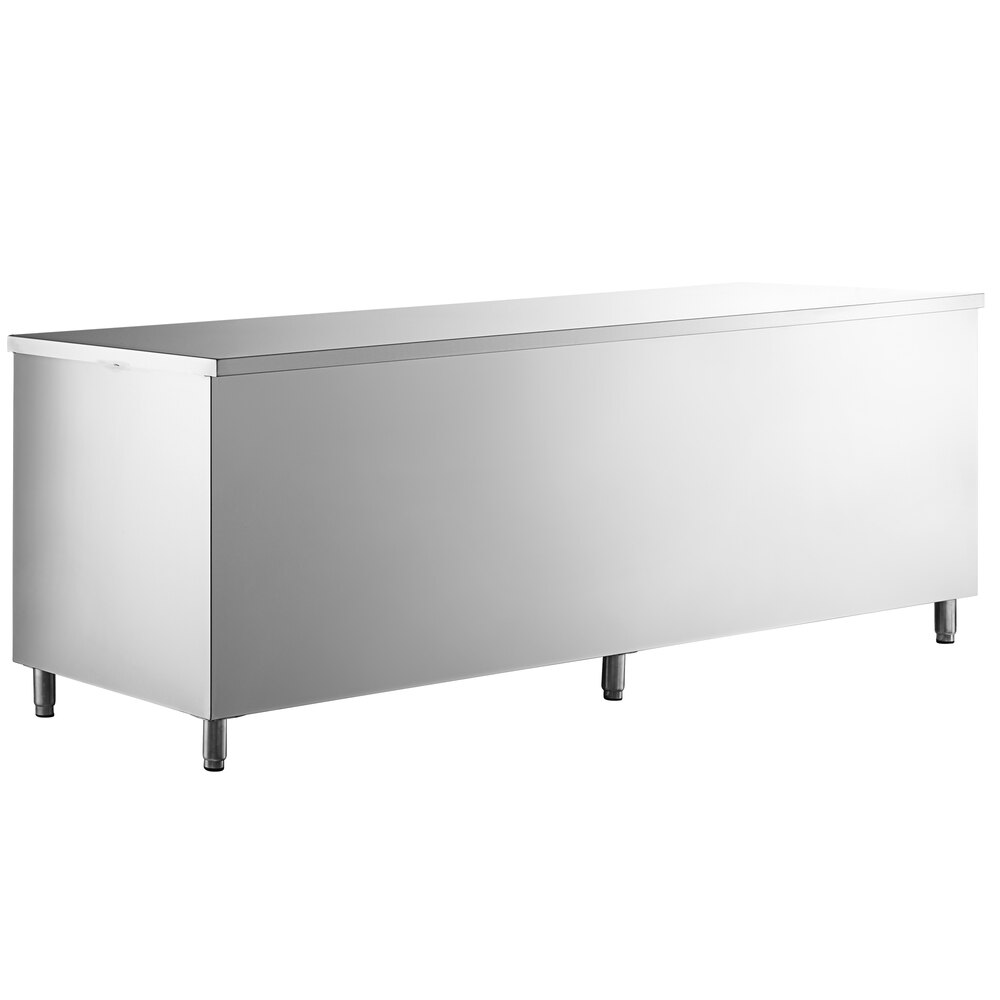 Optimize your commercial workspace with this Regency 30" x 96" 16 gauge type 304 stainless steel enclosed base table with sliding doors and adjustable midshelf.