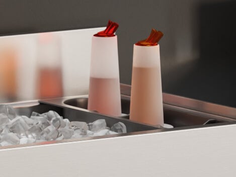 Two plastic bottle holders with removable dividers help keep your mixers nice and cold throughout your busy shifts.