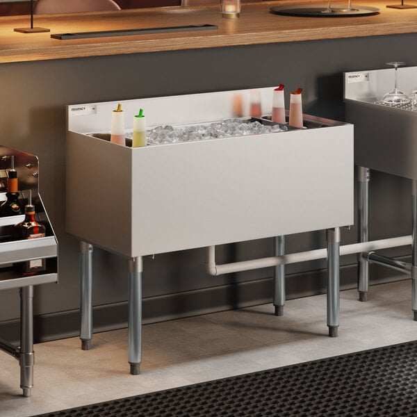 This 119 lb. Regency ice bin gives you ice right where you need it, when you need it. The durable stainless steel bin is easy to keep clean, so it's always sanitary and looking great. Additionally, you get two bottle holders to keep your mixers chilled and easily accessible at all times. Designed to exceed your needs, this standard-duty unit offers an unbeatable value!