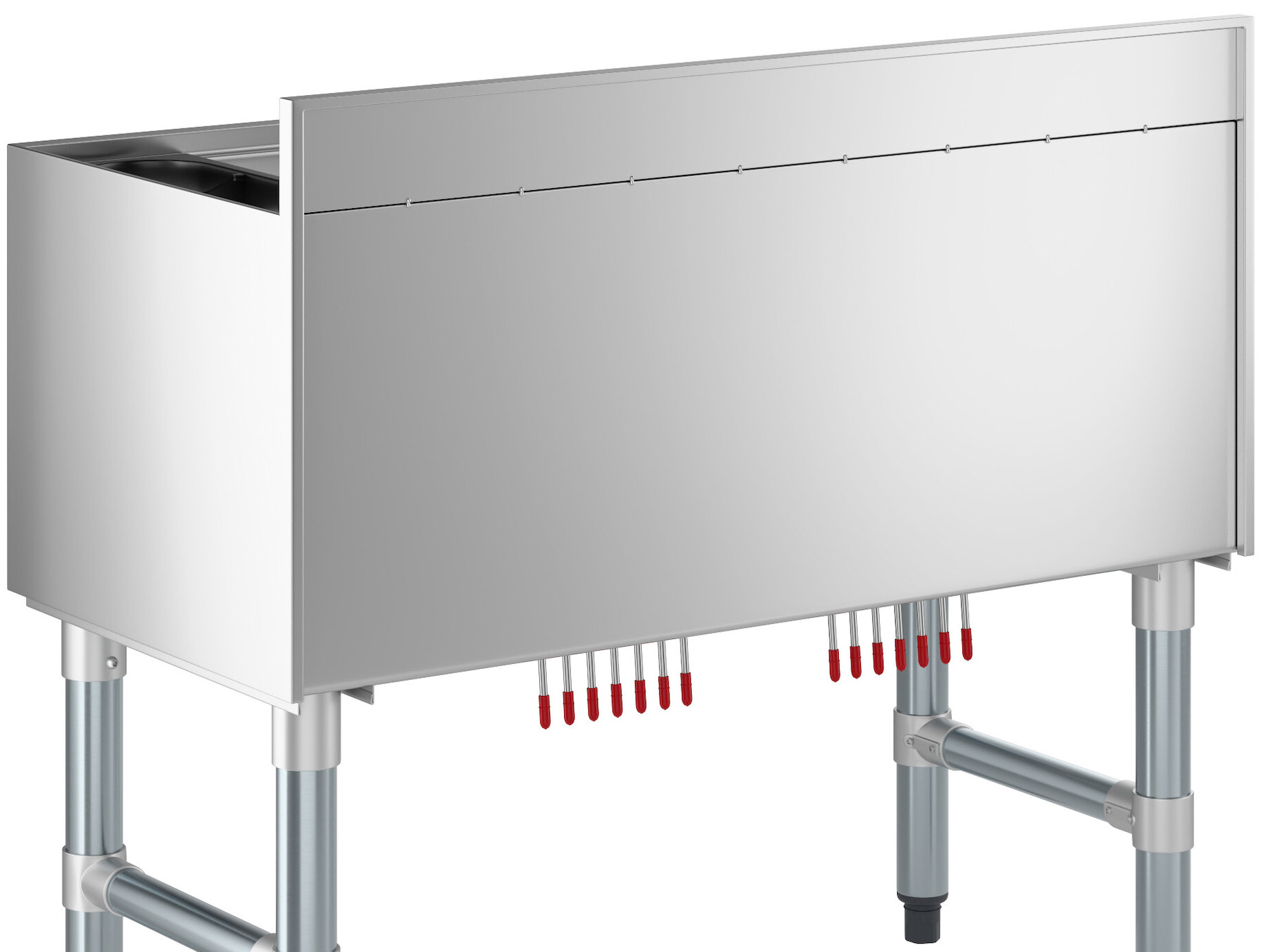 Whether you're serving up a delicious cocktail or a refreshing soda, ensure you have a steady supply of cold beverages at your bar thanks to this standard-duty ice bin. It not only holds plenty of ice but also boasts a post-mix cold plate that allows you to run up to 7 soda lines through the bin to chill them before serving.