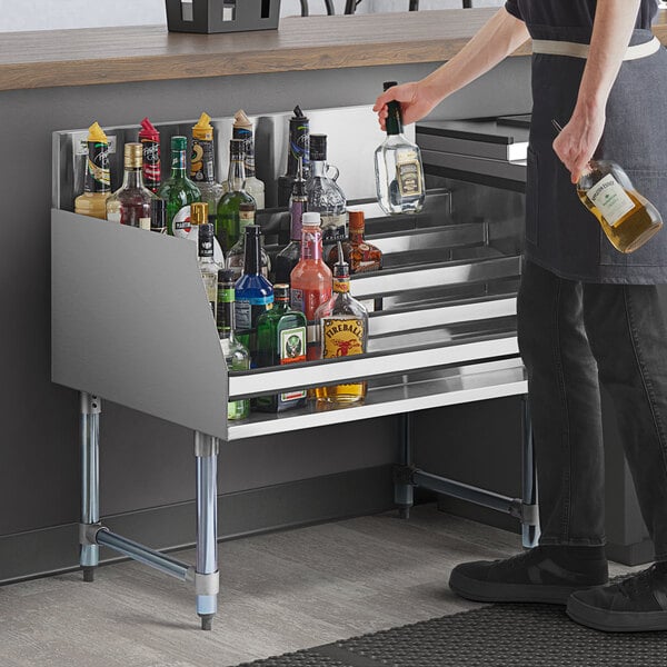 An excellent addition behind virtually any bar, this liquor display rack effectively boosts your bartender's efficiency while offering customers a glimpse of your liquor selection! This rack's bottom, back, sides, hat channel, and steps are made of 18 gauge type 304 stainless steel that not only make it a durable addition to your bar setup, but also one that is extremely simple to clean.