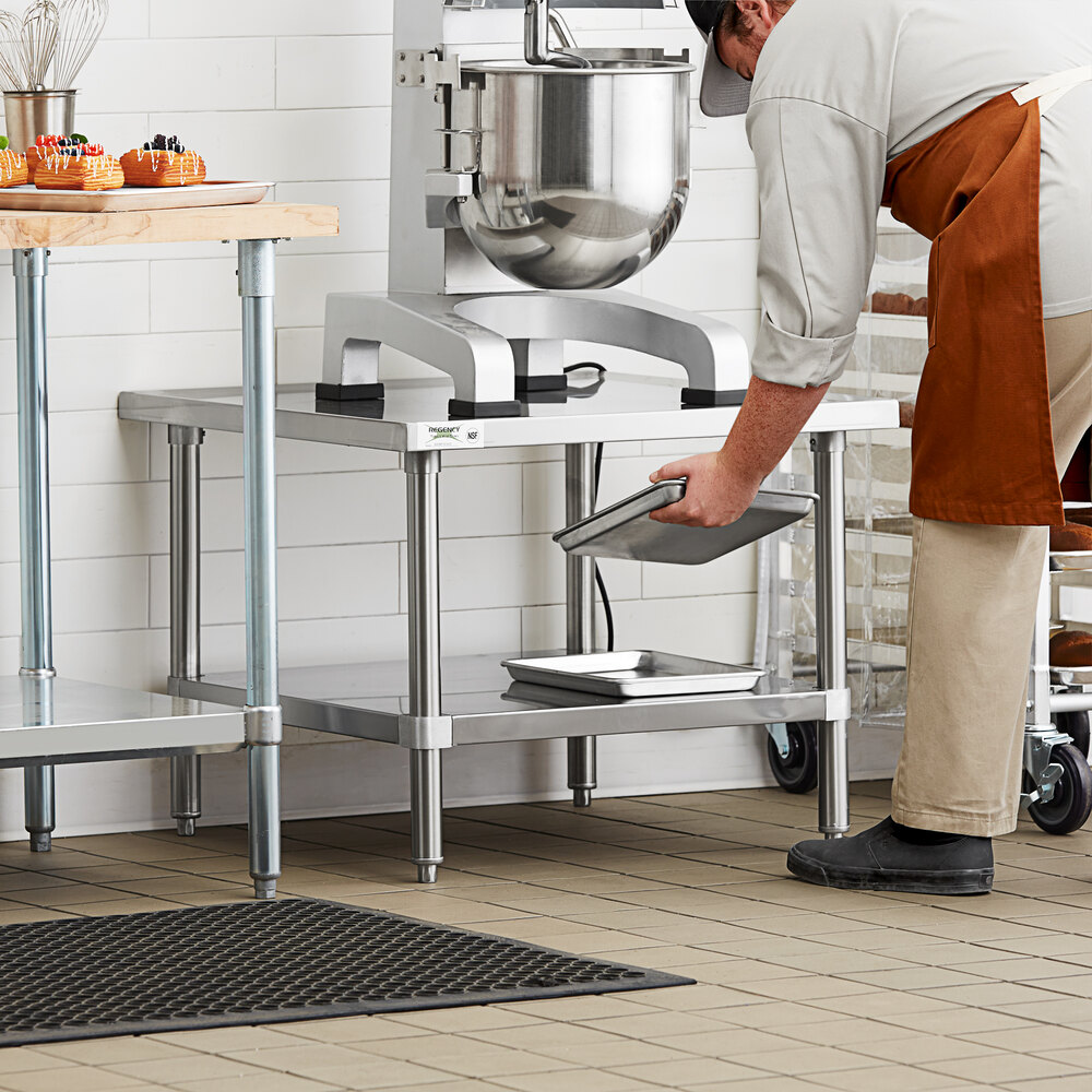 This Regency mixer stand features a durable 16-gauge type 304 stainless steel top shelf that can support up to 800 lb. of evenly distributed weight, making it well-suited for holding up your commercial mixer! It's ideal for bakeries, pizza shops, and other businesses using heavy stand equipment.