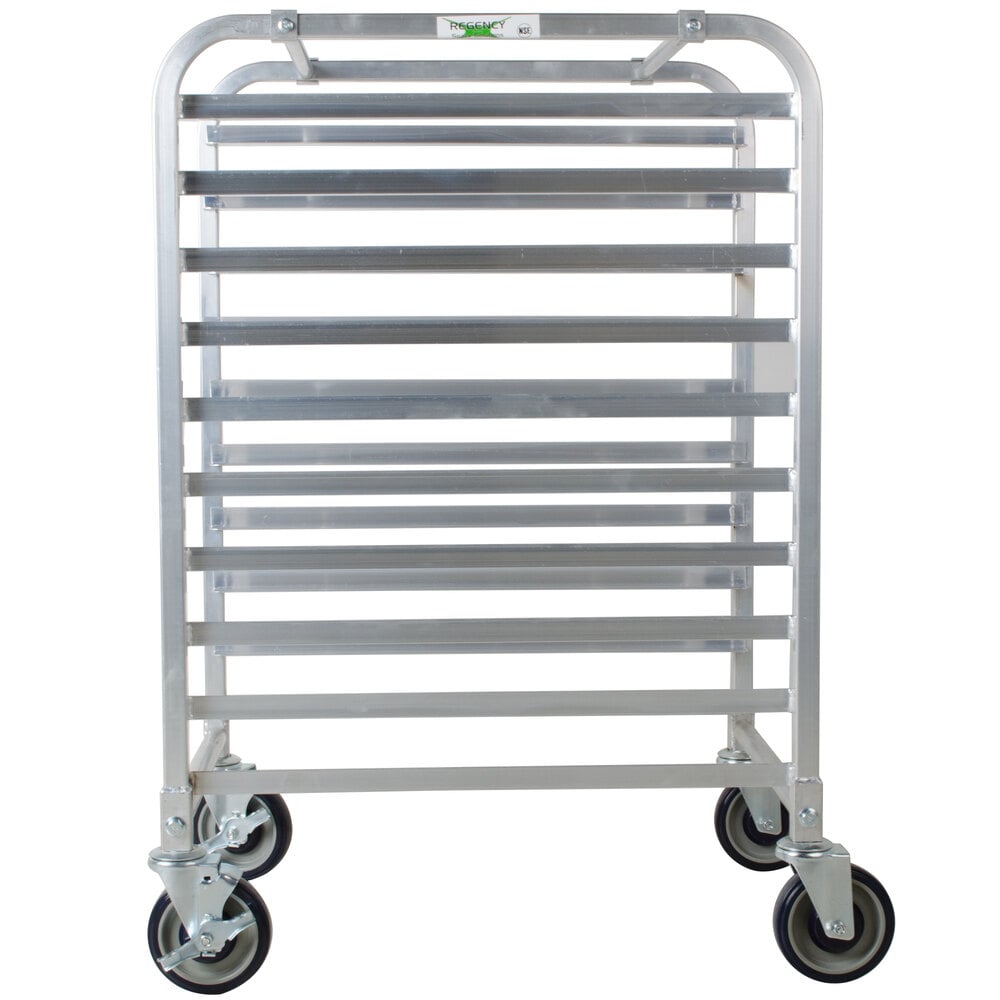 The Regency 10 pan end load half height bun pan rack is perfect for your low- to medium-volume kitchen. Use this product to hold and transport pans full of doughnuts, cookies, baked chicken, or other foods around your back- and front-of-house area. Thanks to its sturdy metal construction, this rack is extremely durable to withstand use in your commercial restaurant, bakery, or cafeteria.