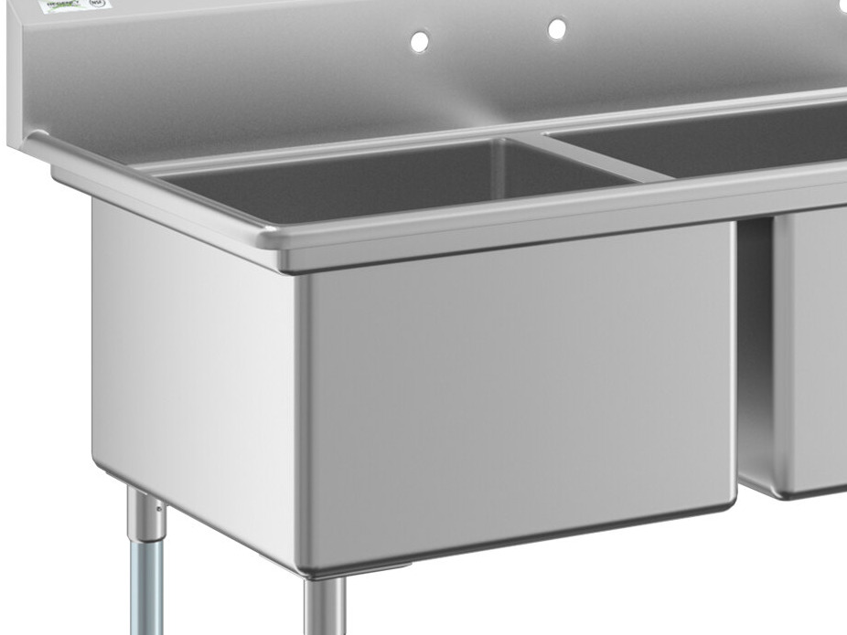 This sink gives you the durability you need with a smaller profile than most other three compartment models, making it especially ideal for low-volume establishments or those with limited space. A 10 3/4" tall backsplash is included with two sets of pre-cut holes on 8" centers to accommodate splash mount faucets (sold separately).