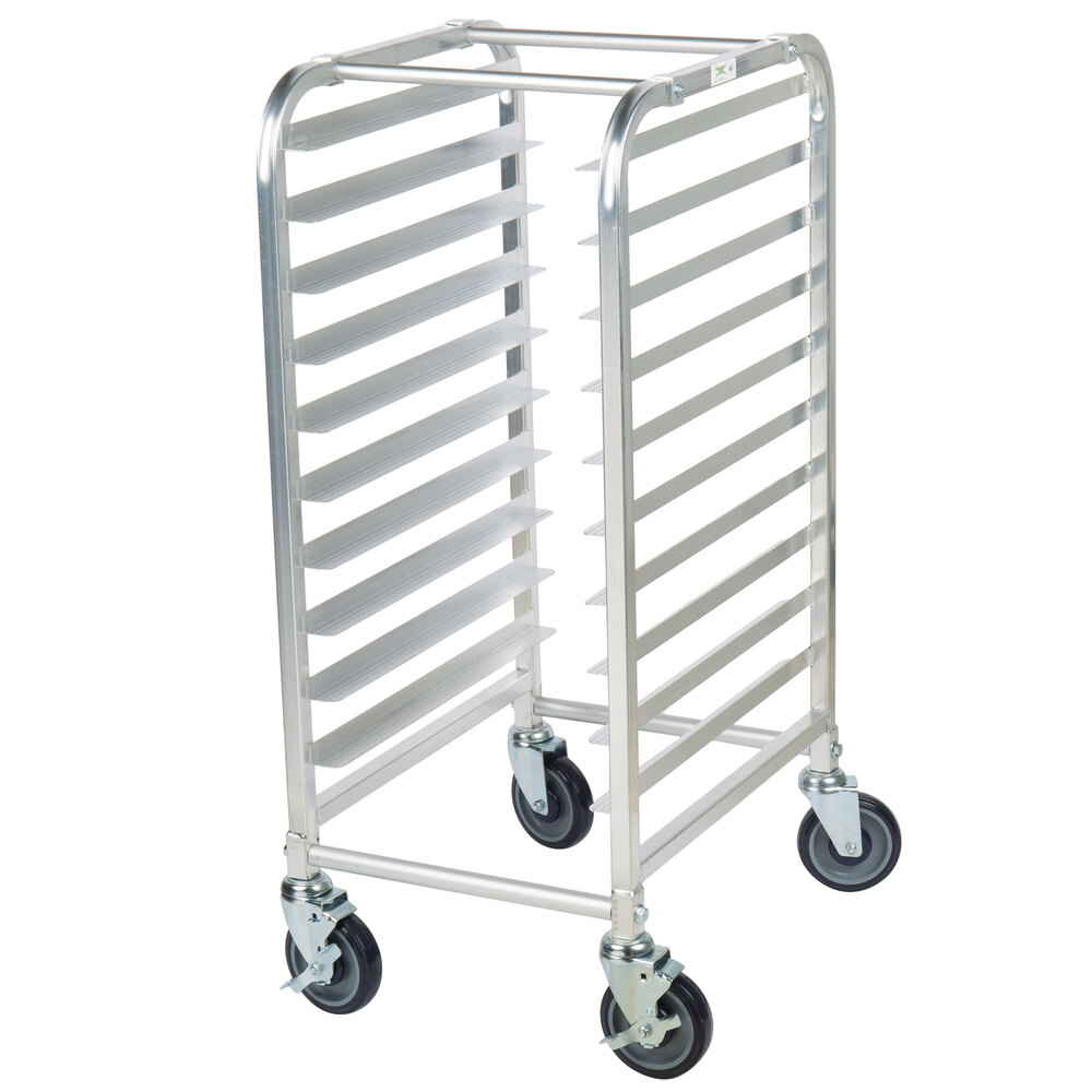 For easy storage and transport, this pan rack is a great, easy-to-use solution. Not only is it built with 18 gauge aluminum for reliability, but it accommodates up to 10 full size steam table pans. A set of casters ensures easy mobility too, navigating through cramped, back-of-house storage spaces and narrow hallways with ease. The rack ships fully assembled for immediate use.