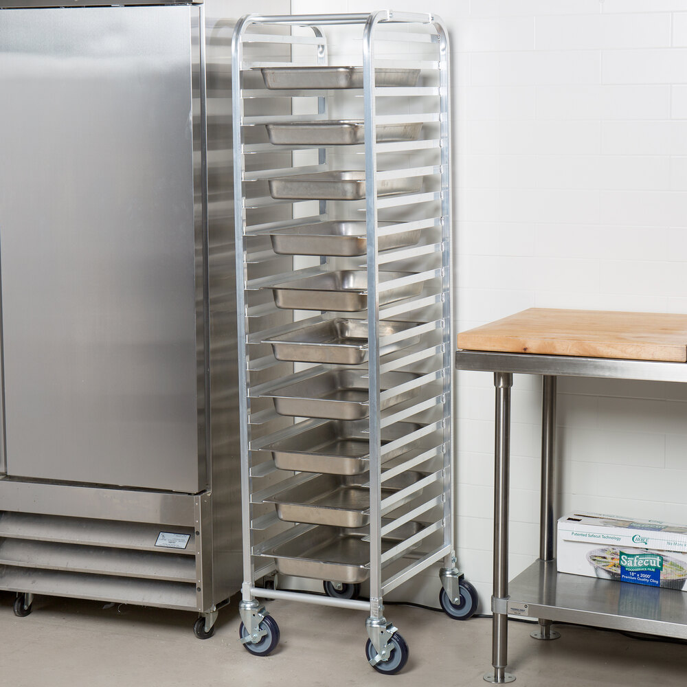 For easy storage and transport, this pan rack is a great, easy-to-use solution. Not only is it built with 18 gauge aluminum for reliability, but it accommodates up to 20 full size steam table pans. A set of casters ensures easy mobility too, navigating through cramped, back-of-house storage spaces and narrow hallways with ease. The rack ships fully assembled for immediate use.
