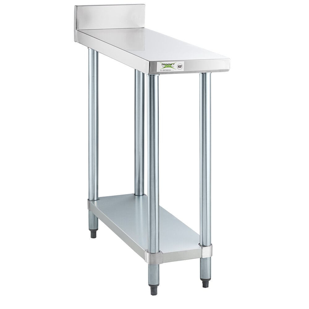 This equipment filler table features a durable stainless steel top shelf to ensure a long service life in your busy commercial kitchen. It's perfect for filling in the gaps that are too small for a wider table, allowing you to make previously unusable space into a valuable asset. The 4" backsplash helps keep contents contained, while its undershelf offers a convenient storage solution, so you can keep everything you need close at hand for a streamlined operation. Assembly is simple using the included hardware.