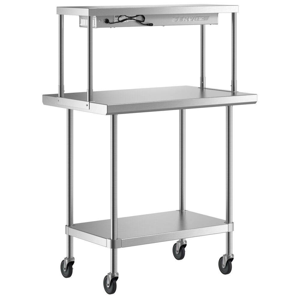 Above the work table, a 12" deep stainless steel single deck overshelf provides a convenient place to mount your strip warmer, while also giving a bit of overhead storage for garnishes, hand tools, plates, and other commonly-used items.