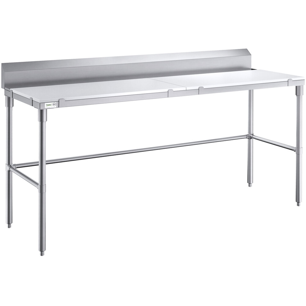 This poly top table features a 14-gauge type 304 stainless steel construction, which offers greater durability and corrosion resistance than type 430 stainless steel options, making it the ideal choice for your kitchen. It's perfect for a variety of tasks, making it extremely versatile. The 6" backsplash helps keep contents contained, while the open base design helps with easy cleaning and storage. Assembly is simple using the included hardware.