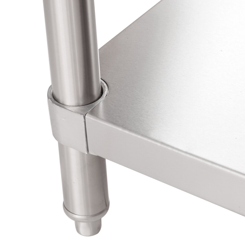 Constructed entirely of stainless steel, this work table is sure to provide the operator with a long-lasting, dependable service life. Ideal for busy kitchens, this work table is easy to maintain thanks to its durable, corrosion resistant material. And, because the top is smooth, the table can be quickly wiped down at the end of a busy shift.