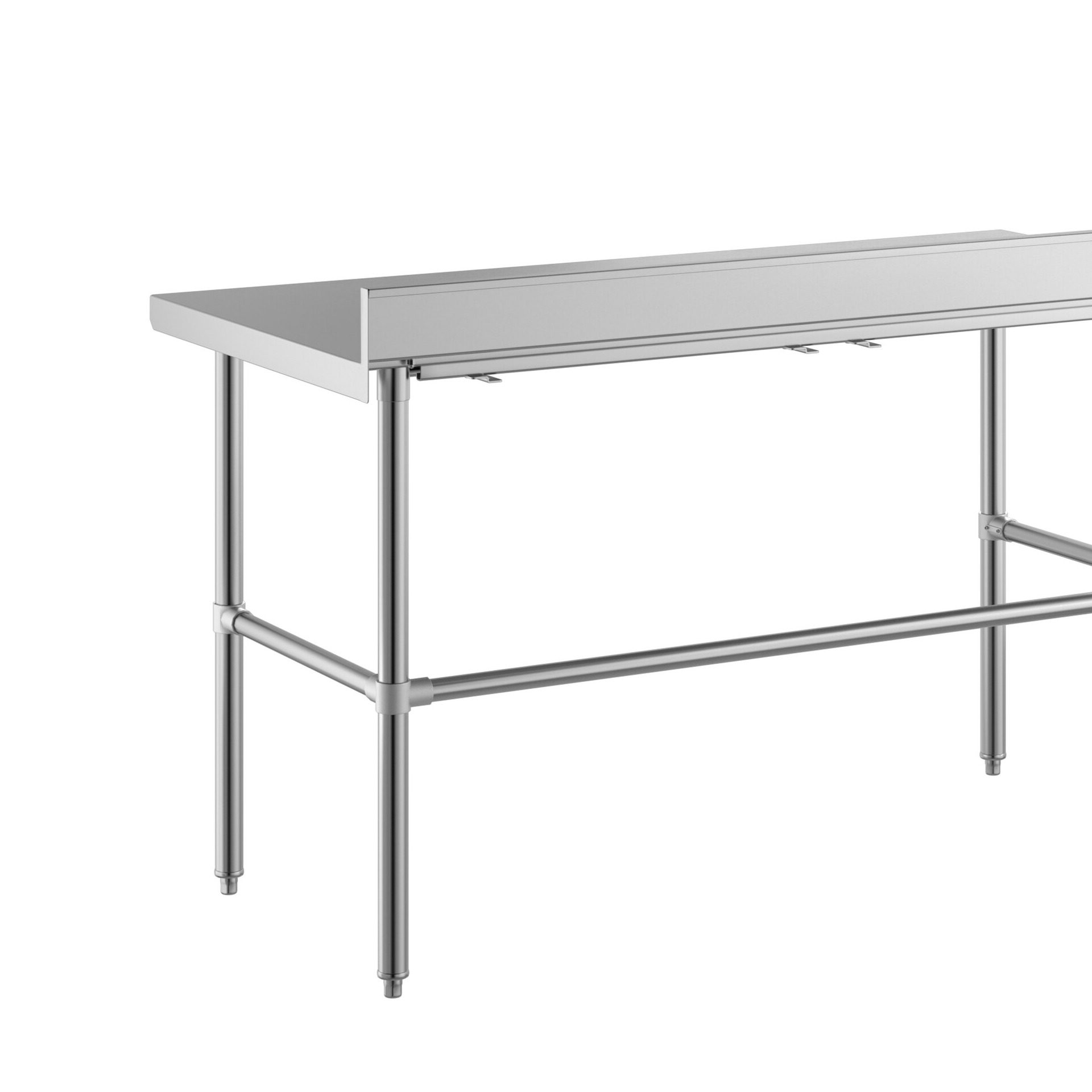 Its all-stainless steel construction can withstand a wide range of tasks in your restaurant, cafe, or bakery. With a working height of 34", you can create a comfortable work station for your employees. The legs of this work table are 1 5/8" in diameter and feature adjustable stainless steel feet, allowing you to account for uneven floors and keep your work surface level. Additionally, to protect your walls during food prep, this work table also features a 4" backsplash.