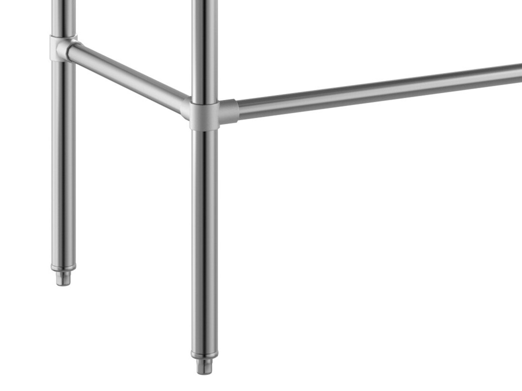 Made from durable, easy-to-clean 14-gauge 304-series stainless steel, this commercial open base work table is corrosion resistant, providing you with long-lasting use and added durability over other work tables made of 18-gauge stainless steel. It's a great option for rolling out dough or chopping fruits and vegetables, providing your staff with additional workspace to complete tasks efficiently. It is the ultimate option to elevate your business!