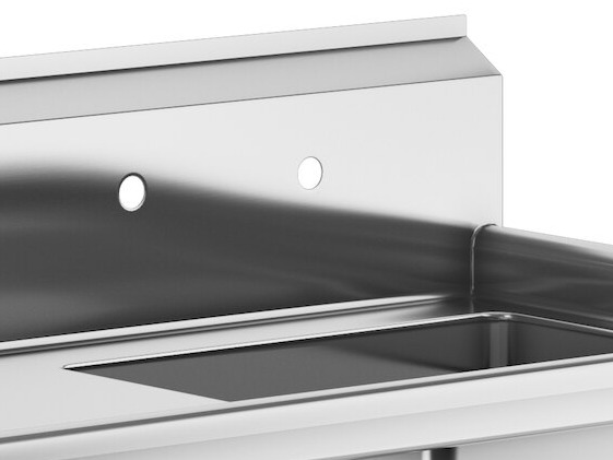 A die stamped, 20 1/4" square, 6" deep pre-rinse bowl directs water down into the drain for efficient operation and easy use. Holes punched on 8" centers allow for easy installation of the pre-rinse faucet.