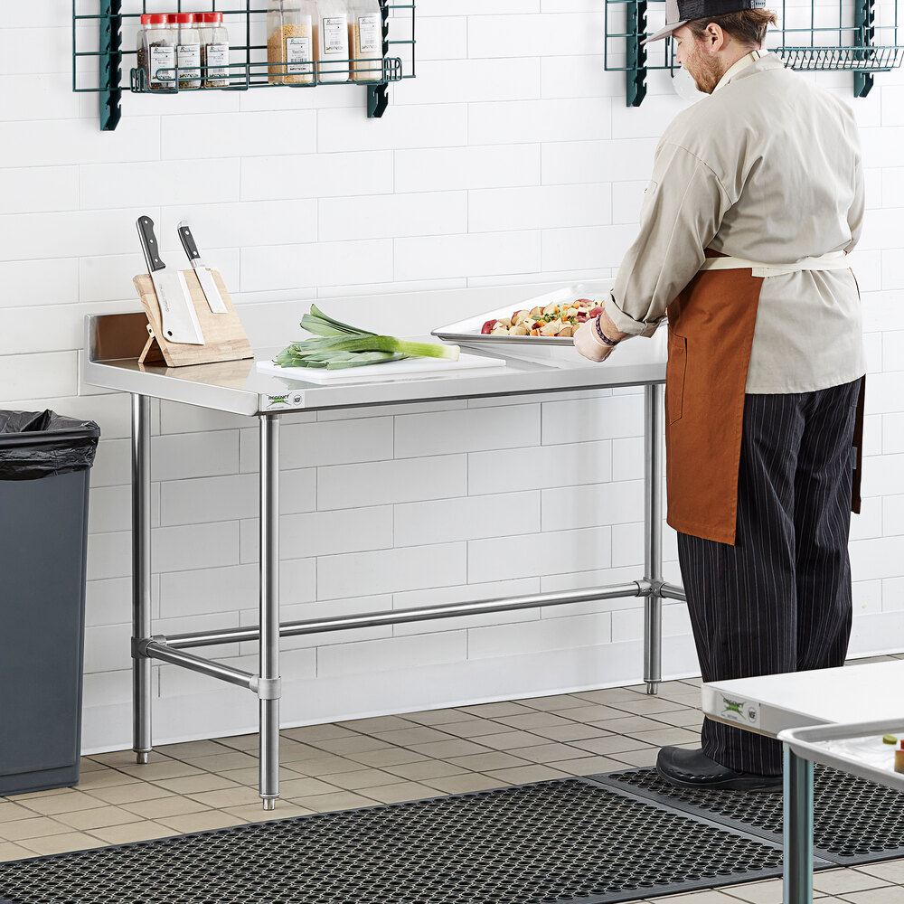 This work table features a 16 gauge, type 304 stainless steel top, which offers greater durability and corrosion resistance than type 430 stainless steel options, making it the ideal choice for your kitchen. It's perfect for a variety of tasks, making it extremely versatile. The 4" backsplash helps keep contents contained, while the open base design helps with easy cleaning. Assembly is simple using the included hardware.