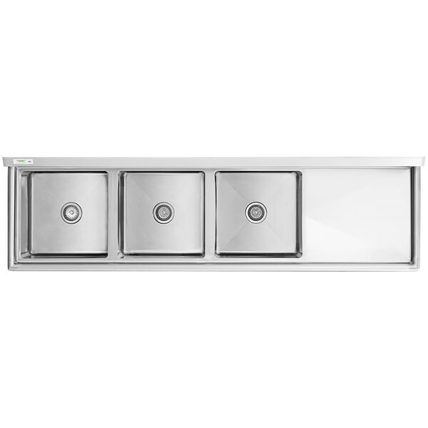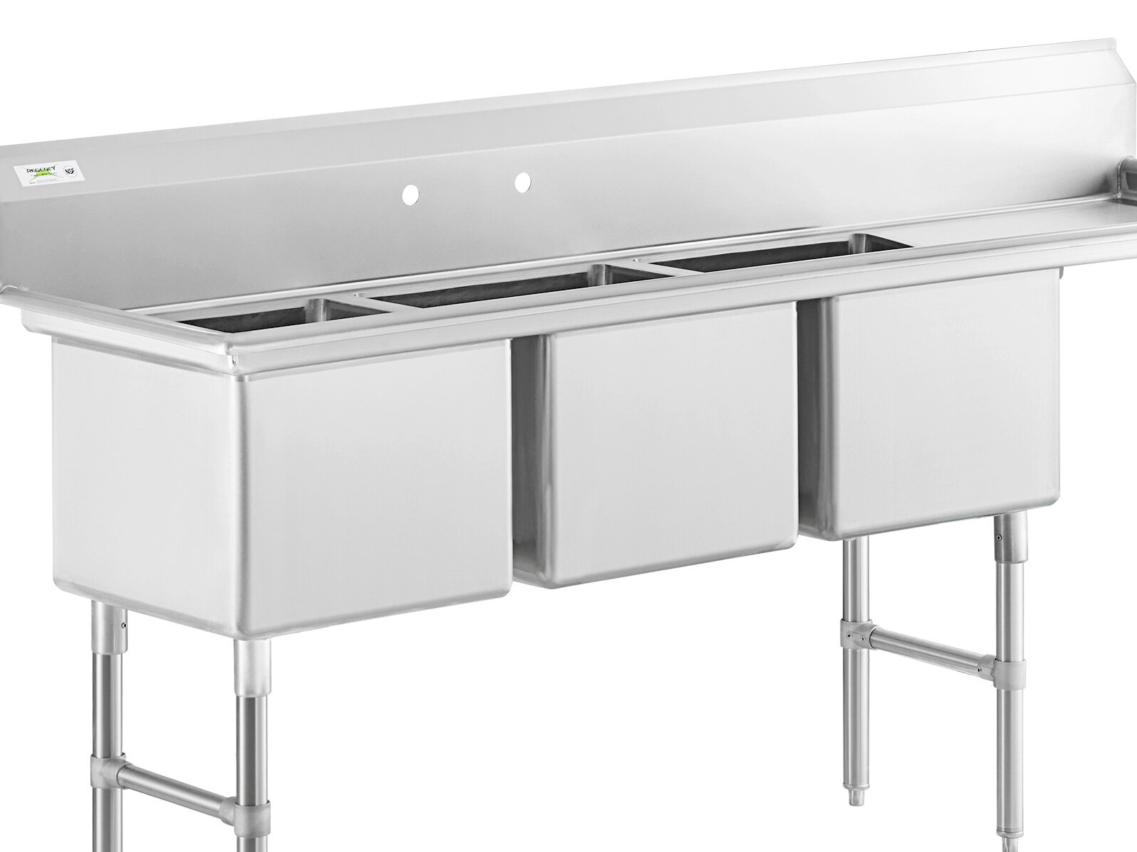 Ideal for setting up a washing, rinsing, and sanitizing station, this Regency 84 1/2" 3 compartment sink with right drainboard is a great addition to your busy commercial kitchen.
