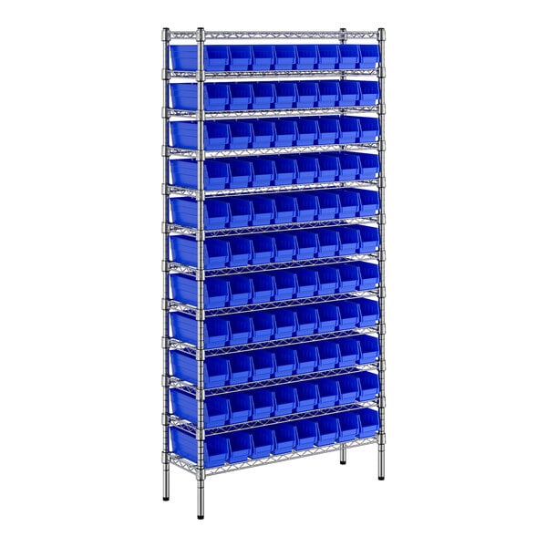 18" x 36" x 74" Wire Shelving Unit with 55 Blue Bins